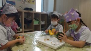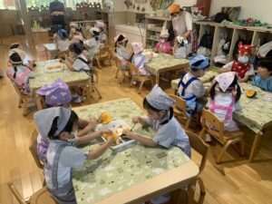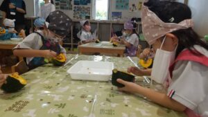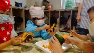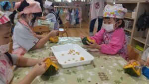 9月10日にあやめ組(4歳児クラス)で食育活動の一環として、かぼちゃを10玉用意し、種取りのお手伝いをしてもらいました。