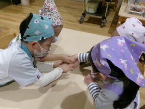 保育室へ向かうと、エプロンと三角巾をバッチリ身に着けて準備万端!