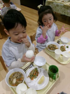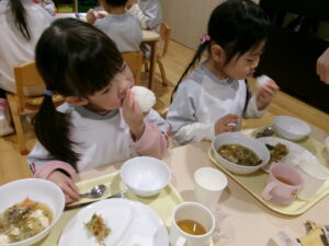 12月16日にかりん組(3歳児クラス)でおにぎりを作りました。