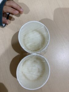 紙コップにご飯を入れてラップと輪ゴムでふたをし、音楽に合わせてフリフリします。